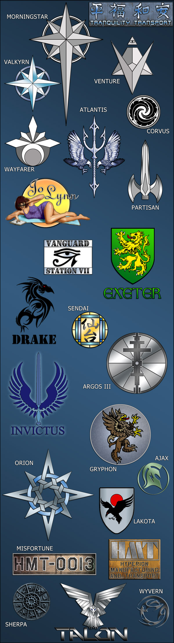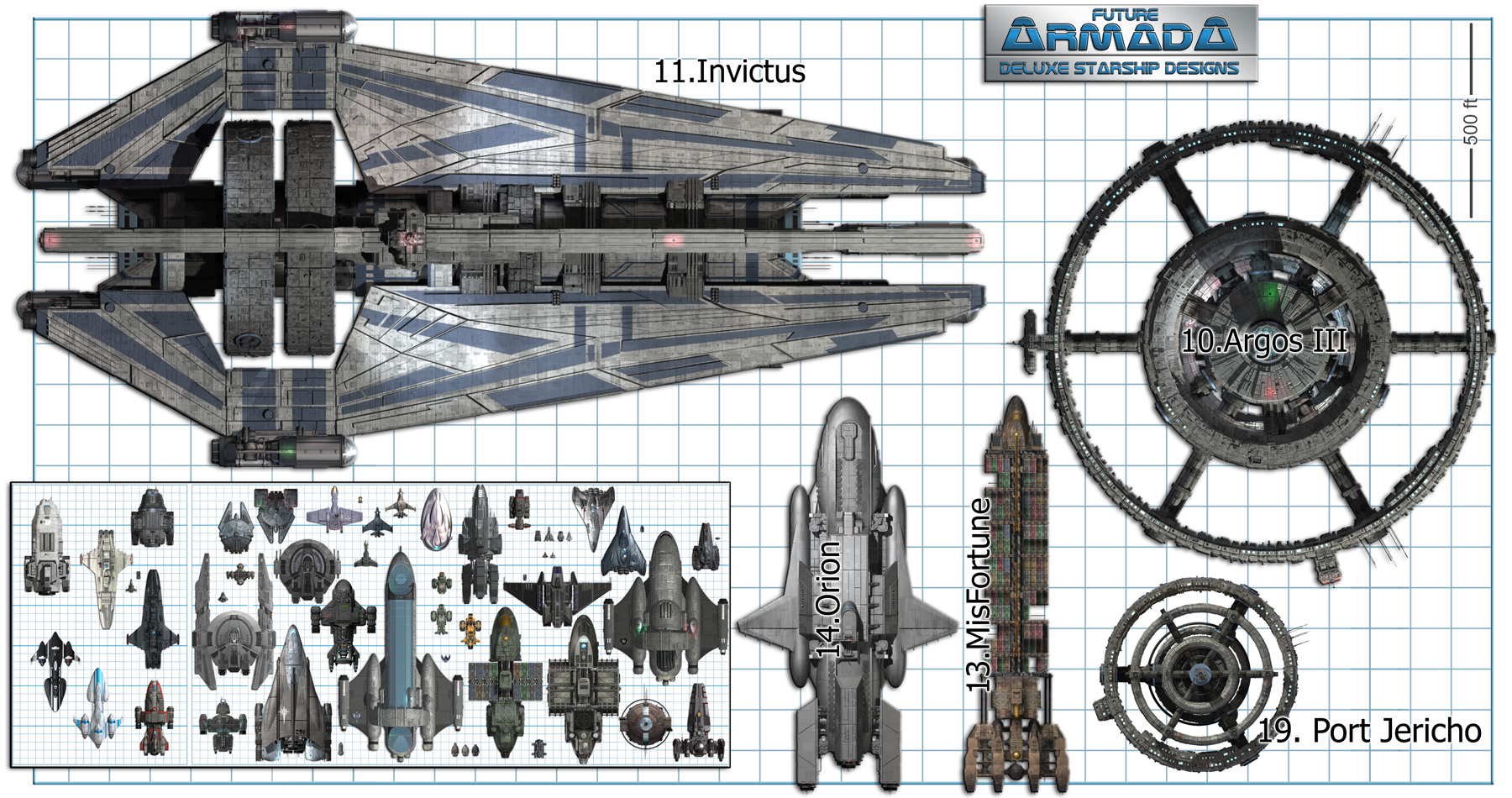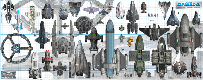 ![]() Since they don't fit well in the image above, I've created a separate portrait of the big ships. For those interested I also drew up a version showing the small ships labeled and another showing the big ships labeled with issue number and ship name. There is also a big image with many of the ship logos available for viewing. ![]() For various reasons, I have made some minor variants of some existing ships, and a whole new deck for the strike carrier Orion. People who own the Future Armada issues can download PDF files with these misc bonus pages and the Orion-specific bonus pages to modify their map layouts. Because many people have asked about the Confederation, I have written up some of my design notes on the Future Armada setting. Lastly, a short Errata Document is provided. It contains corrections that have been made to the products (new updates will already include these changes). Thank you for stopping by - you can contact me with questions or concerns (email information can be found from the main page). I hope that the ships and stations of Future Armada may be of use to you in your campaign. More will be joining the fleet in the months ahead. ![]() Ryan Wolfe |